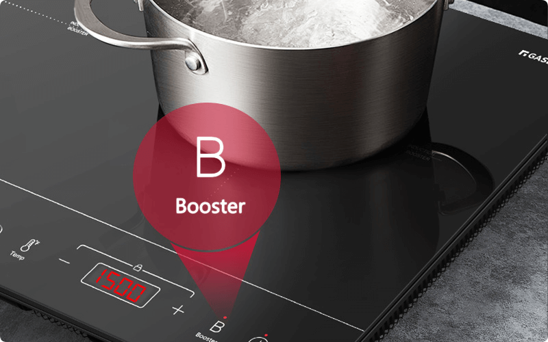 "B" Powerful Boost Heating- 2 boost burners (1500W + 1500W), equipped with 1800W total output for quick cooking. from simmer to boil. The "B" button for the Boost heating enters ultra-high power mode for faster heating.